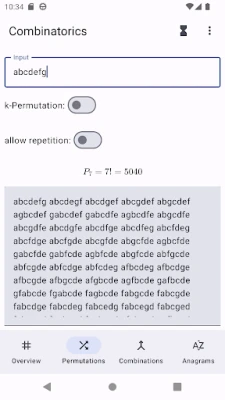 Extra features: * Displays the number of permutations/combinations/... with well formatted mathematical symbols using tex/latex * Ability to share a calculation, for instance to save it to a file or to mail the result * Unicode support, so letters of non latin alphabets and emoticons are also supported * Option to send feedback from within application