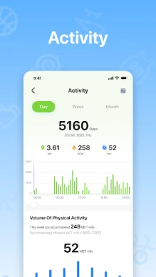 Detailed graph of steps, sleep, heart rate for Day, week and month.