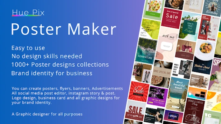Huepix Banner Maker 2022 is the graphic design editor for creating Posters, Flyers, Advertisement Banners, Social Media Posts, Invitations, Business Cards, Logo Designs and any kind of graphic designs for business promotion and marketing.