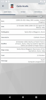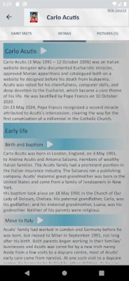 • Facts and Learning Insights: Dive deep into detailed facts about each saint’s life, virtues, and patronage, along with historical context. The platform offers insights and learning opportunities designed to increase your understanding of the Church's history and spiritual heritage.